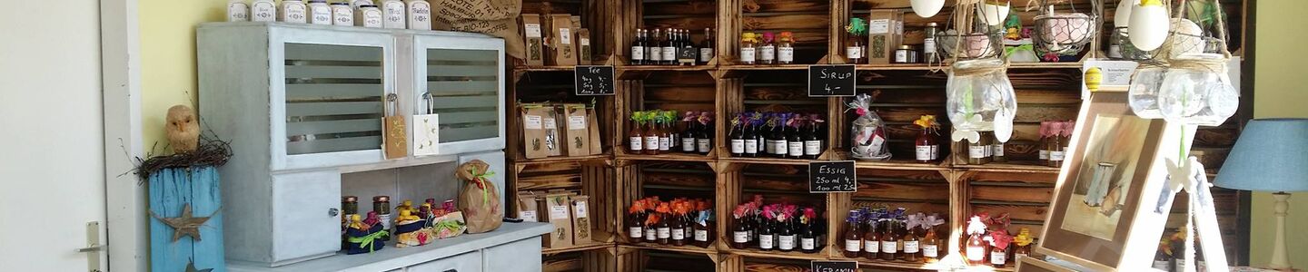 Hier findet ihr Naturprodukte aus Kräutern und Obst unserer Region wie z. B. Sirup, Essig, Kräutersalze, Chutney, Gelee, Honig und Kräutertees.